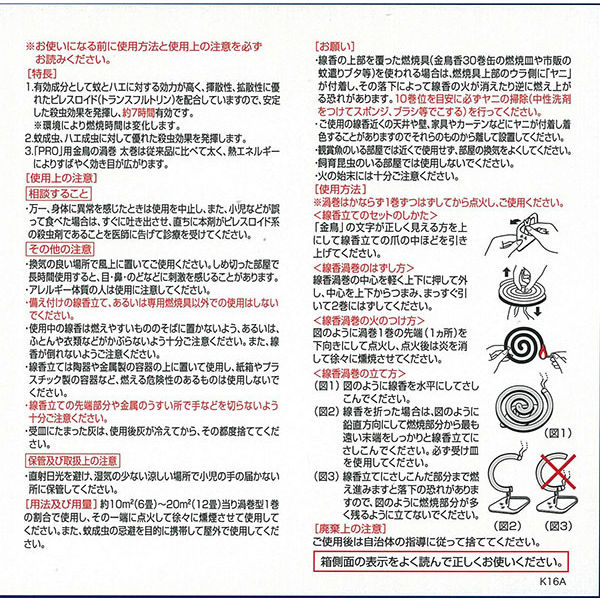 ※渦巻はかならず1巻ずつはずしてから点火し、ご使用ください。<線香立てのセットのしかた>「金鳥」の文字が正しく見える方を上にして線香立ての爪の中ほどを引き上げてください。<線香渦巻のはずし方>線香渦巻の中心を軽く上下に押して外し、中心を上下からつまみ、まっすぐ引いて2巻にはずしてください。<線香渦巻の火のつけ方>渦巻1巻の先端(1ヶ所)を下向きにして点火し、点火後は炎を消して徐々に燻焼させてください。<線香立ての使い方>(1)点火した線香を、引き上げた爪に水平に差し込んでください。(2)線香を折った場合は、鉛直方向にして燃焼部分から最も遠い末端をしっかりと線香立てにさしこんでください。必ず受け皿を使用してください。(3)線香立てにさしこんだ部分まで燃え進みますと落下の恐れがありますので、燃焼部分が多く残るように立てないでください。