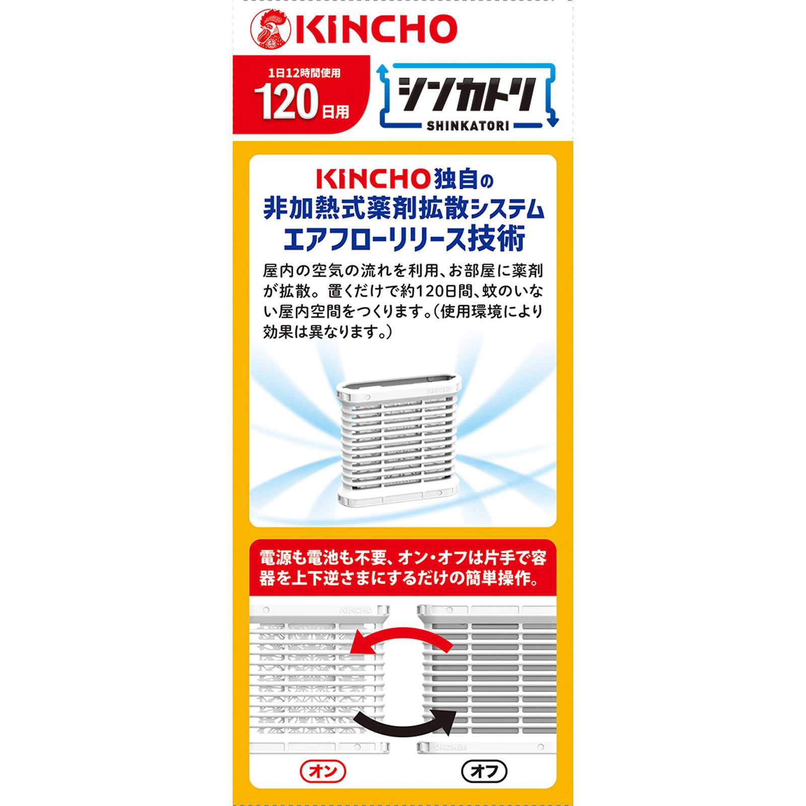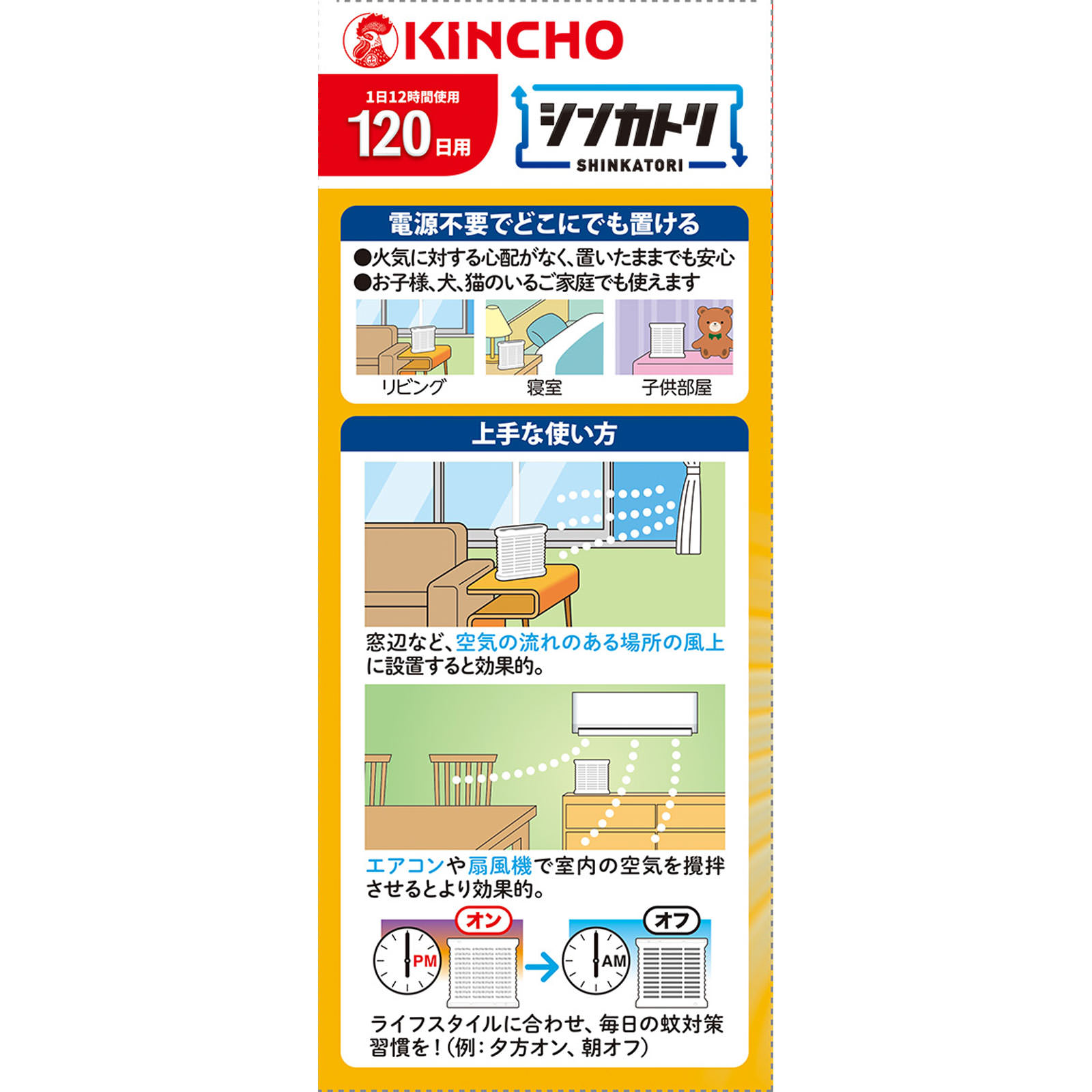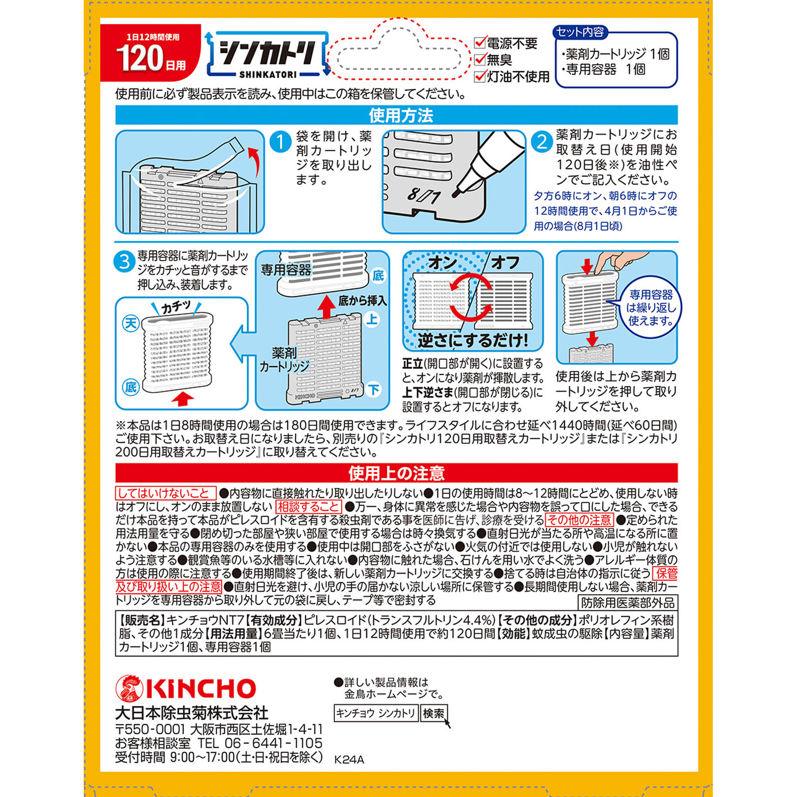 (1)袋を開け、薬剤カートリッジを取り出します。(2)薬剤カートリッジにお取替え日(使用開始120日後※)を油性ペンでご記入ください。夕方6時にオン、朝6時にオフの12時間使用で、4月1日からご使用の場合(8月1日頃)(3)専用容器に薬剤カートリッジをカチッと音がするまで押し込み、装着します。・正立(開口部が開く)に設置すると、オンになり薬剤が揮散します。・上下逆さま(開口部が閉じる)に設置するとオフになります。専用容器は繰り返し使えます。・使用後は上から薬剤カートリッジを押して取り外してください。※本品は1日8時間使用の場合は180日間使用できます。ライフスタイルに合わせ延べ1440時間(延べ60日間)ご使用下さい。お取替え日になりましたら、別売りの「シンカトリ120日用取替えカートリッジ」または「シンカトリ200日用取替えカートリッジ」に取り替えてください。